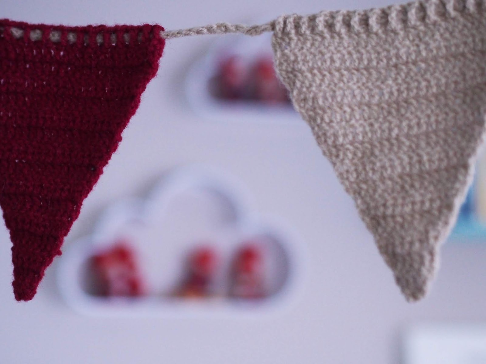 Tekstiilien lisäksi pienet tontut valtasivat huoneen. Tonttuja on vähän siellä ja täällä tarkkailemassa tätä pientä miestä. Tontut toivat toki mukanaan myös autonsa. Kierrätyskeskuksesta ostettu auto ei kestänyt parin vuoden takaisia leikkejä mutta vähän kolhiintuneena ja uudelleen kasaan liimattunakin on mielestäni aika ihana tunnelman tuoja.